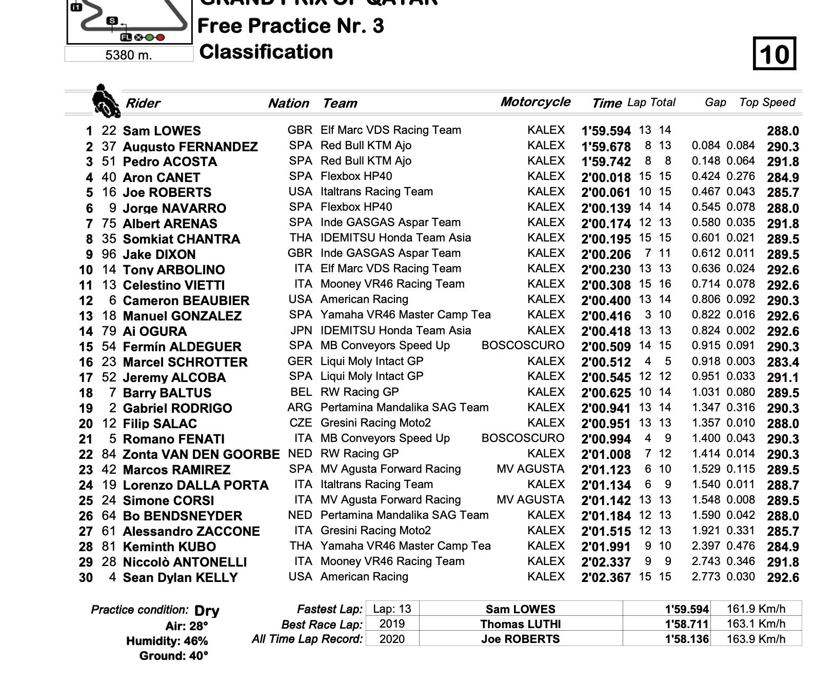 Auf Platz vier abgelehnt der erste der Blues, nämlich Celestino Vietti, Aron Canet schließt die Top 5 ab. Platz sechs für der einzige Fahrer in den Top Ten, der sich verbessern konnte, nämlich Sam Lowesetwa eine halbe Sekunde vor dem Gipfel, gefolgt von Ai Ogura, Filip Salac, Somkiat Chantra und Cameron Beubier.