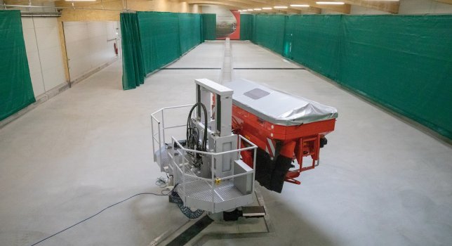 In der Halle liegt 88 Sammelmülltonnen mit einem automatischen Hochgeschwindigkeitswiegesystem, das in Sekundenbruchteilen die eingesetzte Düngermenge erfasst und das Gewicht auf das Zehntelgramm genau misst. Modernste Düngermess- und Analysetechnik sammelt Daten aus jedem Testzyklus und wandelt sie in ein dreidimensionales Ausbreitungsbild um, das in der Praxis von unschätzbarem Wert ist. Sie bilden die Grundlage für umfassende Simulationen der Düngerausbringung (sie werden für eine genaue und vollautomatische Düngerausbringung auf dem Feld benötigt). Arbeitsgeschwindigkeit kann im Testraum simuliert werden od 2 machen 43 km/h. Mit einer Sammel- und Wiegevorrichtung kann die Verteilung unterschiedlicher Mengen an körnigem Dünger in Quer- und Längsrichtung unter verschiedenen Bedingungen genau bestimmt werden. Die Halle umfasst auch ein Düngemittellager, Roboter sowie ein Besucher- und Kontrollzentrum. Während des Tests wurde der Streuer mit einem 360°-Drehbereich auf dem Roboter platziert. Die vollklimatisierte Halle garantiert ganzjährig konstante Prüfbedingungen 20-25 °C und maximale Luftfeuchtigkeit 55%.
